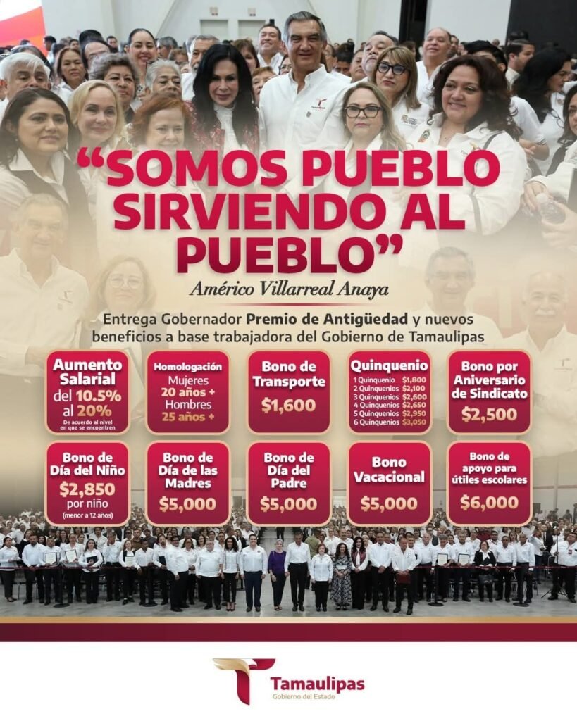 En un marco de unidad, respeto y agradecimiento y con la presencia del gobernador del estado Américo Villarreal Anaya acompañado de su esposa la Presidenta del Sistema DIF Tamaulipas, la Dra. María de Villarreal Santiago y ante cientos de servidores públicos se llevó a cabo la Ceremonia de Entrega del Premio Estatal de Antigüedad en el Servicio Público 2024, en donde se dio, asimismo, la respuesta al pliego petitorio 2025 dentro de la Conmemoración del LVll Aniversario de la Promulgación del Estatuto Jurídico.